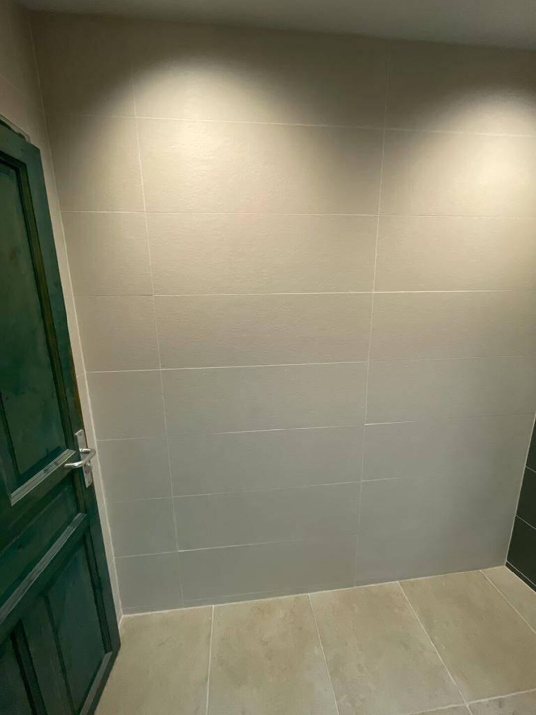 Le chantier a débuté par la démolition de l’ancien aménagement et la mise à nu de la pièce. Nos équipes ont ensuite procédé à la remise aux normes de la plomberie et de l’électricité, avec l’intégration d’un système d’éclairage performant et économique.